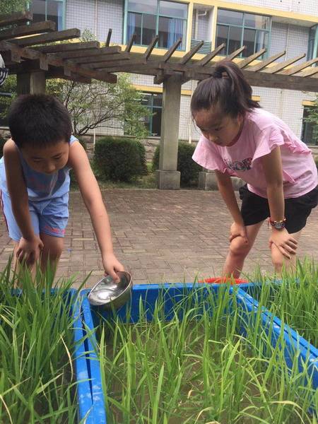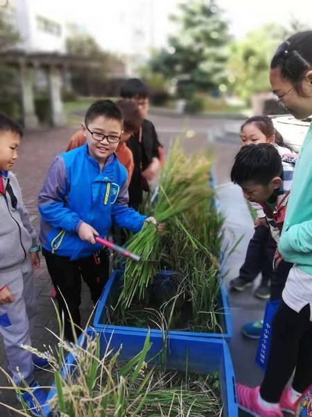 沉甸甸的果实来之不易,从准备种植桶的泥土、泡种、播种、育秧、插秧、管理到收获凝聚了学生、老师和家长太多的心血。尤其是水稻的管理过程,无论是烈日炎炎,还是倾盆大雨,同学们都坚持定期到校给水稻浇水、施肥和打农药,一次都没有落下。孩子们把水稻苗当宝宝一样呵护着,他们见证了水稻的成长过程,他们与小禾一起成长。