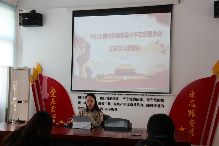 3月25日中午,中共无锡市安镇实验小学支部全体党员在党员活动教室开展了以“学习贯彻两会精神暨党史学习教育”为主题的支部主题党日活动。本次活动由副校长黄芳主持。
