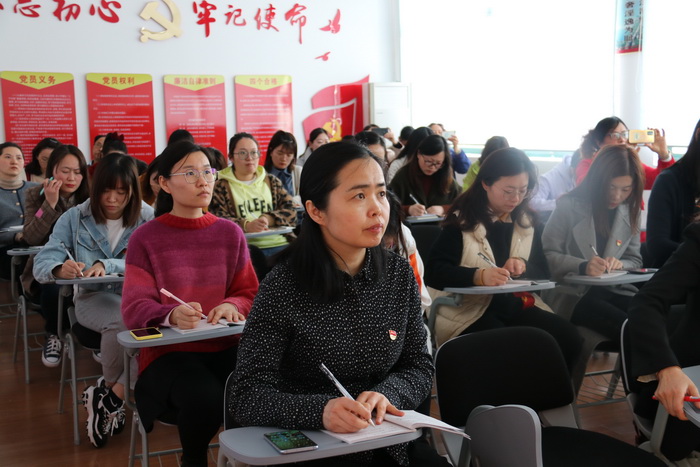 大会分为两个议程,第一议程是黄芳校长带领大家学习教育系统如何深入贯彻落实两会精神以及主要内容。大家一起学习了习总书记关于教育工作发表的一系列谈话精神,明确了要把“建设高质量教育体系”作为未来五年教育事业发展的总任务,要注重完善体系、机制、制度,在公平和质量上取得新的实质性进展。之后一起学习了全国政协委员、江苏省锡山高级中学校长唐江澎在两会中的发言,了解了“好的教育”的真谛。通过学习,党员同志纷纷意识到要用新的理念促进教育发展,以新的面貌提高教育成效。