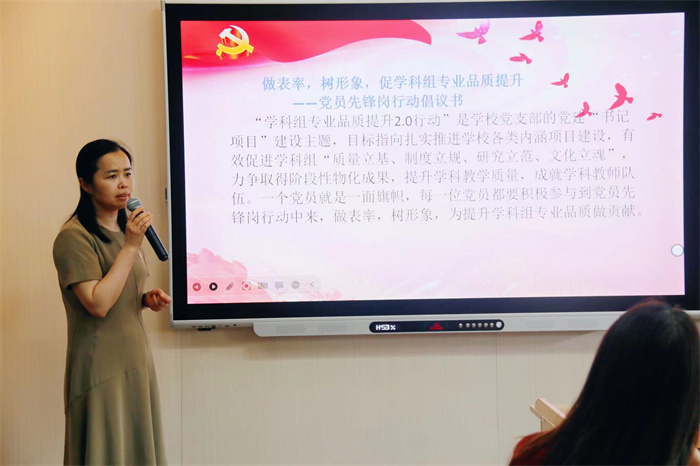 李淑英书记首先带领全体党员学习了“以学铸魂、永葆忠诚强担当,以学增智、践行宗旨勇担当,以学正风、廉洁奉公善担当,以学促干、推动发展敢担当”的“四学四担当”内容。李书记结合学校《做表率,树形象,促学科组专业品质提升——党员先锋岗行动倡议书》,倡导每位党员要“提升学习力、提升行动力、提升创造力”,做表率,树形象,为提升学科组专业品质做贡献。李书记鼓励每位党员行动起来,师德师表,好于群众;教育教学,优于群众;科研创新,多于群众;参与活动,先于群众;工作作风,感染群众,真正在工作中实践党员的先进性,带动全校教师做有理想信念、有道德情操、有扎实学识、有仁爱之心的四有好教师。接着,李书记结合2023年上半年支部工作,召开了组织生活会,党员们针对上半年的思想、工作等进行了自我剖析,明确了未来努力的方向。最后,在中国共产党成立102周年来临之际,全体党员在李书记的带领下,重温入党誓词,不忘教育初心,践行育人使命。