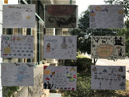 我校各个年级围绕这主题举行了各色各样的活动,四年级是英语“单词大狂欢”。他们从Halloween这个单词开始单词接龙,虽说对于四年级的孩子来说,单词量并不是很大,但这一点都没有打消他们的积极性,他们查阅单词表、查阅电子辞典,准备了很多单词,组合起来真可谓是一条长龙!除此之外,他们还给单词长龙配上了万圣节的元素,瞧那一个个南瓜、魔鬼的图样,多么惟妙惟肖。