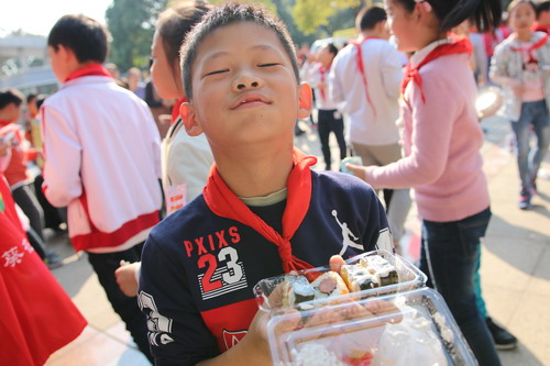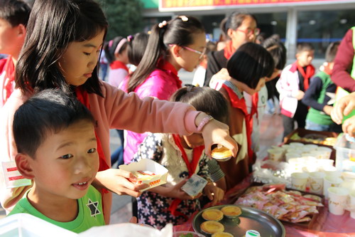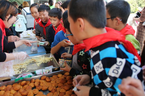开幕仪式后,“美食乐翻天”活动拉开帷幕。在老师和家长志愿者的共同努力下,安小广场“变身”美食一条街,各色中外美食玲琅满目:三年级10个班级“经营”起了一个个特色小铺。三(1)班的红薯银耳羹、黄金地瓜片、奶香地瓜丸子,各色红薯小吃让人眼花缭乱;三(3)班的红豆面包、红豆饼、红豆蛋挞、红豆春卷让人直流口水;三(8)班的“玉米之家”也是异彩纷呈:脆皮玉米棒、脆皮玉米香肠、玉米沙拉、玉米烙、玉米饼、玉米纸杯蛋糕,种类齐全、夺人眼球;三(9)班“舌尖上的芋头”最为畅销,桂花糖水芋艿、芋圆奶茶、白糖芋头、香酥脆芋头条大受欢迎……让人垂涎的各色美食,加上制作精美的宣传海报、放声吆喝的家长志愿者、同学们,安小的广场上沸腾起来了。