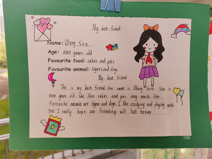 经过本次“My friends”卡片制作的活动,同学们对于好朋友有了更深入的了解,促进了彼此间的友谊。另外,许多同学用到了Unit6中的重点单词和句型,真正做到了学以致用。在制作卡片的过程中,同学们在构图、绘画等方面的能力也得到了提升,实现了英语学科与美术学科的融合,具有深远意义。