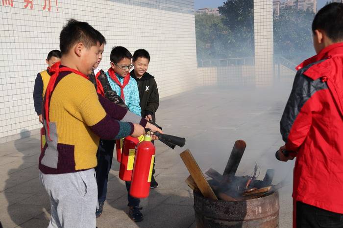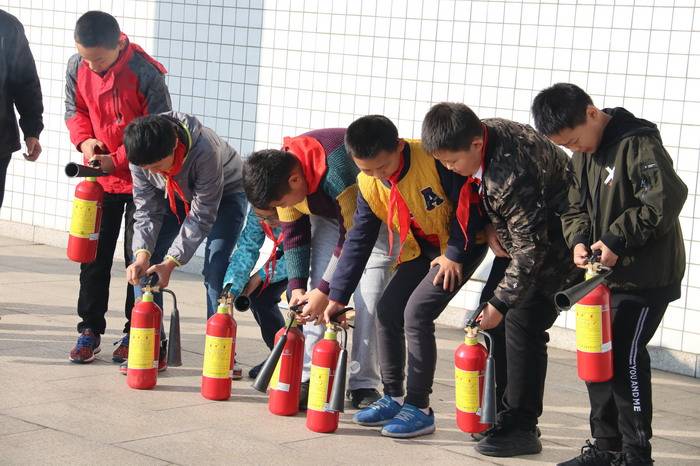 师生们集合在大操场后,教导处黄莉老师进一步介绍了火灾自救的知识。接着,总务处安明强老师为学生讲解了干粉灭火器的功能及使用方法,并由六年级学生进行了灭火器使用现场演练。在老师的指导下,学生迅速扑灭了预置火源。