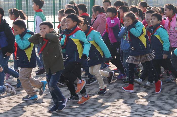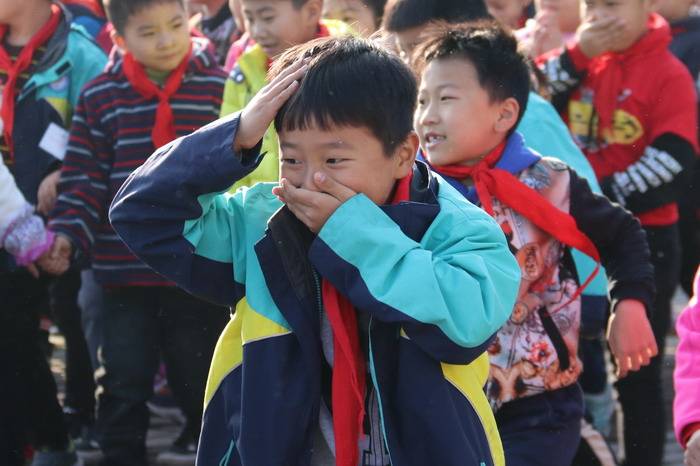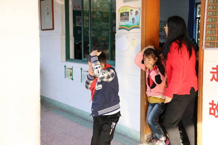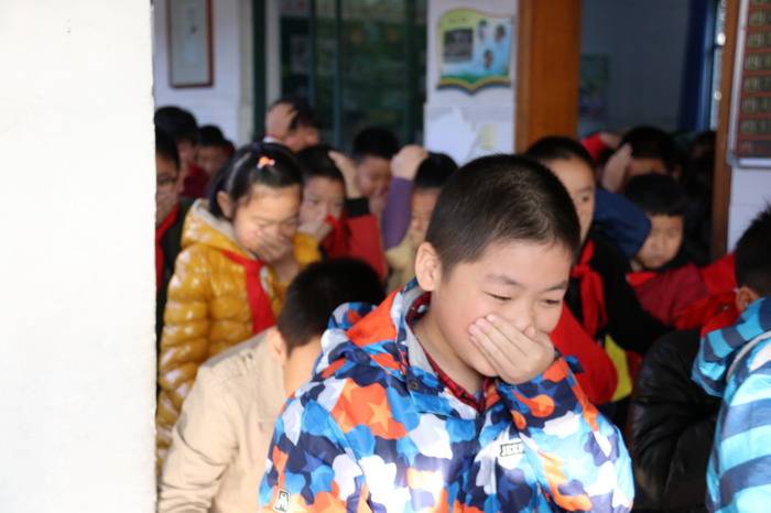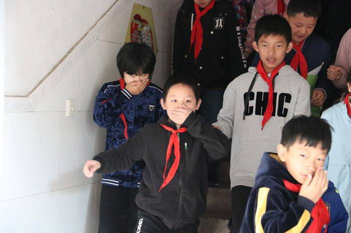 随着逃生演习警报声的响起,各班教师立即带领学生,按照规定线路快速从教室疏散到操场安全地带。在逃生演习中,学生捂嘴、猫腰,迅速有序地撤离教室。
