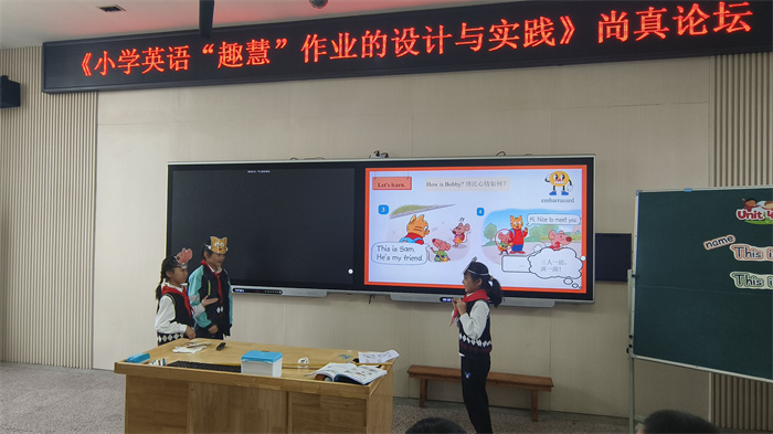 接着,三年级英语组的五位老师分别为大家汇报了Unit4 This is my friend单元整体教学设计实践。教研组长钟梦玲带领团队为大家详细阐述了基于主题意义探究的单元各板块内容分析与实践、教学收获与反思,并结合《小学英语“趣•慧”作业的设计与实践》课题,呈现了单元作业进阶设计,强调作业评价要坚持能力为重、素养导向原则,发挥育人功能,促进学生核心素养。