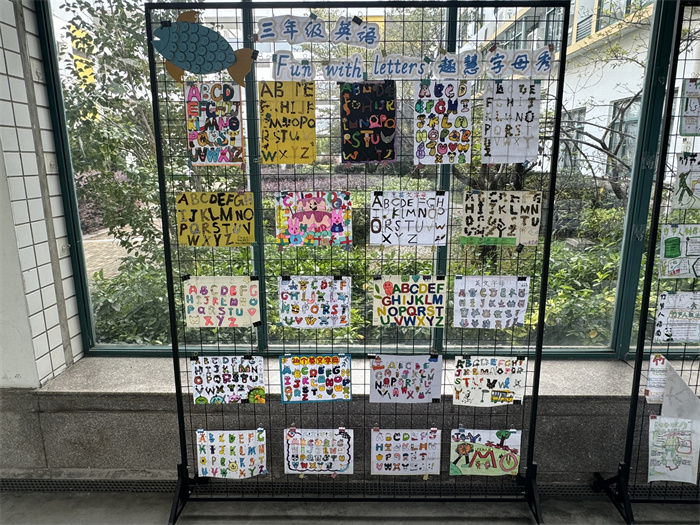 结合所学的26个英文字母,孩子们制作了“Fun with letters”字母秀主题活动。展板上,一个个字母仿佛被赋予了生命,它们有的端庄大气,以规整的书写和独特的设计展现着规范之美;有的俏皮可爱,以绚丽的色彩和夸张的造型吸引着孩子们的目光,从 A 到 Z,每个字母都诉说着不同的故事,激发着学生们的想象力和创造力。