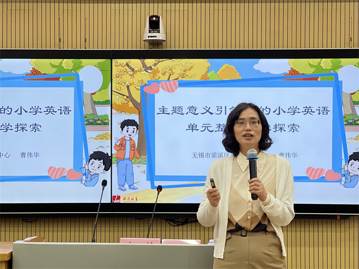 梁溪区教师发展中心研训员曹伟华老师为大家带来了《主题意义引领下的小学英语单元整体教学探索》的专题讲座。曹老师详细地阐述了主题意义引领下小学英语单元整体教学的缘起、内涵和设计。她指出教师在研读新教材时需要深入浅出,从专家思维、学生立场思考教学设计。此外,曹老师还结合具体课例阐述如何运用关键要素设计单元学习活动,从而在主题意义的引领下,探究单元主题大观念和单元语言大观念。