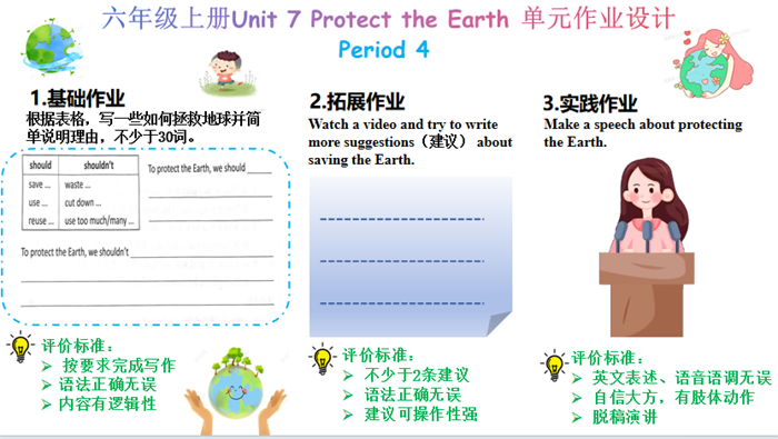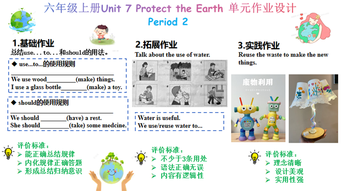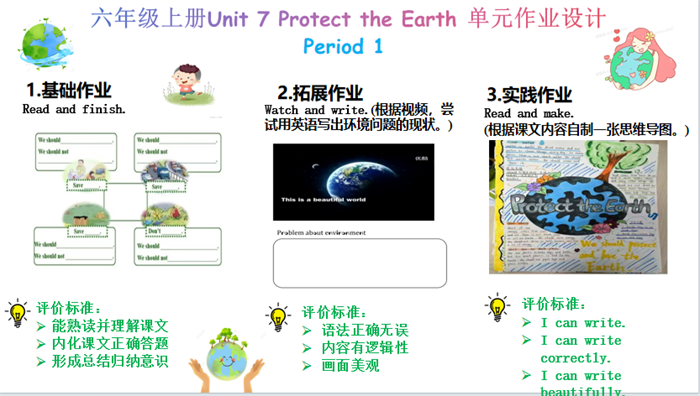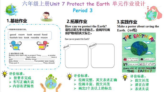 此外,课题组成员转变了作业的传统功能定位,将其视为学生展示自我、探索知识的舞台。在设计上,作业模式更多元,融入了丰富的情境模拟、项目探究等元素。如六年级U7 Protect the Earth单元,设计了一份以“小小环保使者”为主题的综合实践任务,其中包含制作英文宣传海报、撰写倡议书等任务,让学生在解决问题的过程中,不仅复习了相关词汇和句型,更培养了他们的社会责任感和创新思维。