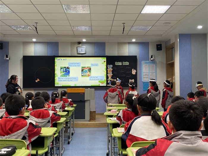 安镇实小的过星老师执教了四上《Unit8 Dolls》复习与融合课。过老师的课更具常态化,开始以歌曲导入,让孩子们在歌曲中捕捉单词信息,通过描述娃娃的外貌特征复习本单元介绍五官的重点句型。再通过小组合作,展示自制的娃娃来操练句型,这样的设计由易到难,层层递进。随后自然过渡到绘本教学板块,运用启发式的语言,引导学生学会观察,层层推进,以问题激发学生思维,渗透 “There’s something everyone can do!” 的情感,最后用孩子们熟知的运动员相关视频,把绘本精神带入日常生活,最终引到儿童自身,让孩子们有的放矢。过老师的课还把希沃白板巧妙的运用到课件制作中,比如说在复习拓展环节中,制作娃娃脸部时使用了希沃独有的授课克隆模式;展示孔雀选手时运用了蒙层的技术。本节课从教材回归生活,在融合理念的关照下提升学生的人文素养、综合素养。