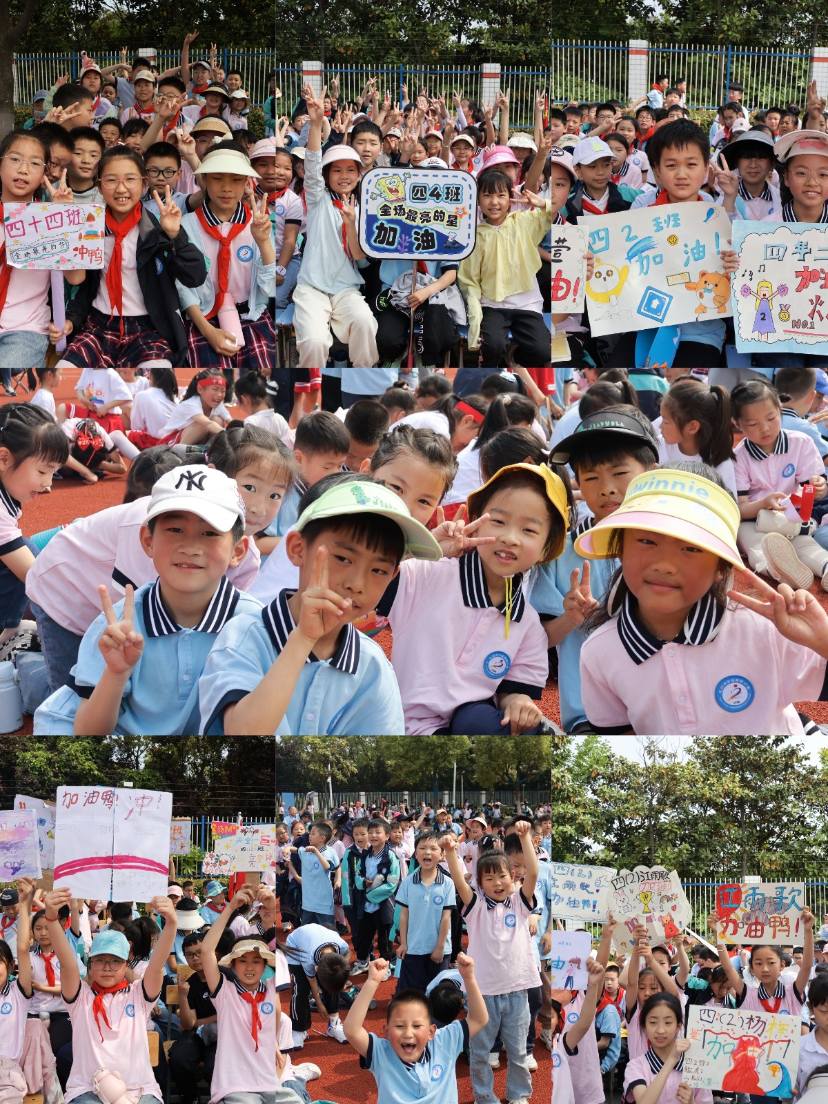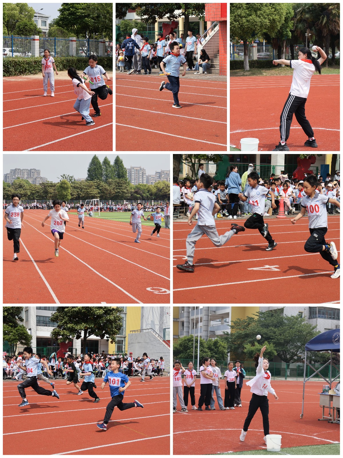 看!一道优美的弧线展现在眼前,孩子们的投掷项目扔得又远又高;跳远的孩子们也在迈着大长腿奋力向前跳起。运动场上随处可见小运动员参加比赛的身姿,他们都铆足了劲,使出最好的竞技状态。场下啦啦队员们此起彼伏的加油声响彻整个校园。同学们在竞赛中释放着热情、感受着健康、飞扬着快乐。