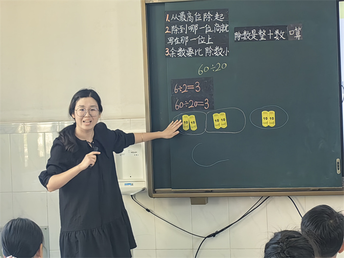 数学组:九位参赛老师执教四年级上册《除数是整十数商是一位数的除法口算和笔算》。老师们基于新课标理念,引导学生借助实物图、小棒、画图等多种表征方式来分析运算过程,自主经历算理和算法的探索过程,理解算理,掌握算法,并结合计数单位在发散、对比中感悟计算的本质,体会数的运算本质上的一致性,培养运算能力和推理意识。