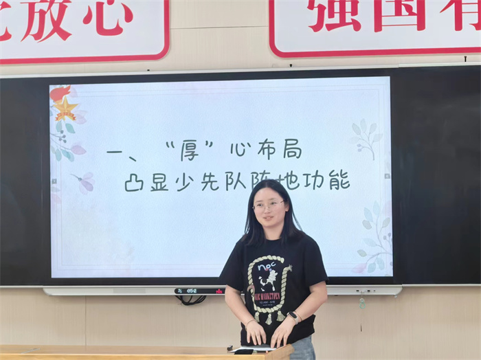 接着,厚桥实验小学大队辅导员、无锡市德育新秀韩惠老师为大家作了主题讲座《创建星级队室 闪耀火炬星光》,韩老师从“厚心布局,凸显少先队阵地功能”“厚彩特色,丰富少先队活动内涵”“厚实队务,打造靓丽风景线”“厚制管理,提升队员主人翁意识”四个方面,介绍了厚桥实验小学星级队室的创建经验。