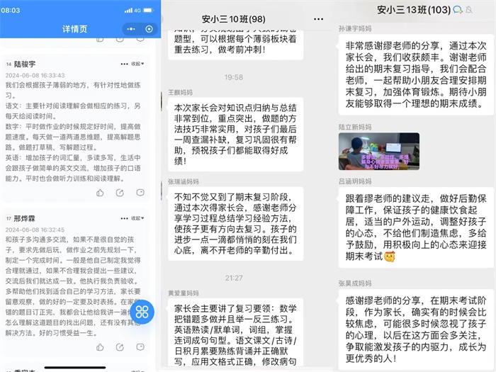 各班老师为期末复习献策,结合学科特点分别解读了期末复习计划,根据学生的不同情况提出有针对性的复习建议,真正做到减负增效,分层递进。同时指导家长为学生心理健康护航,希望家长与孩子进行心与心的交流,用心聆听、用心感受。会后,许多家长还和老师们进行了更深入的交流,共同检视得失、交流感受、解决困惑……