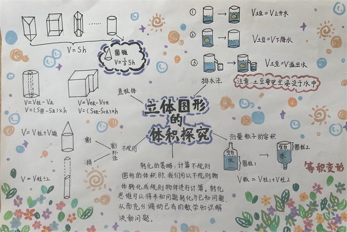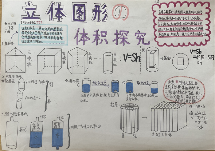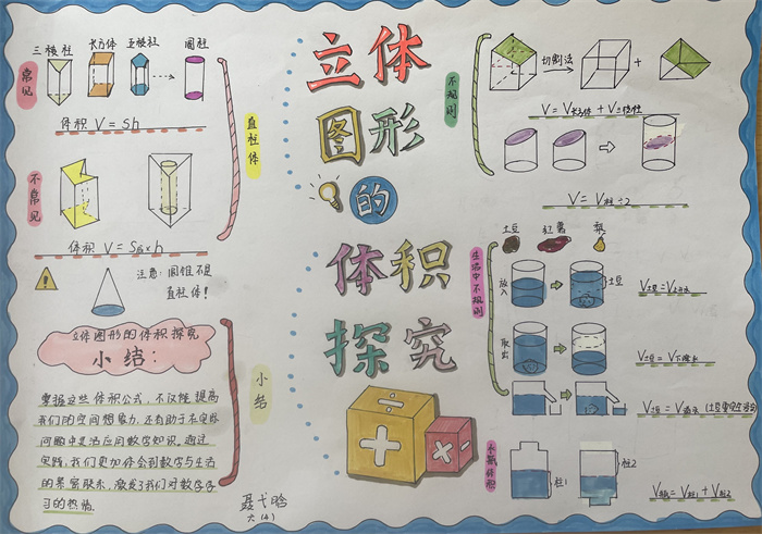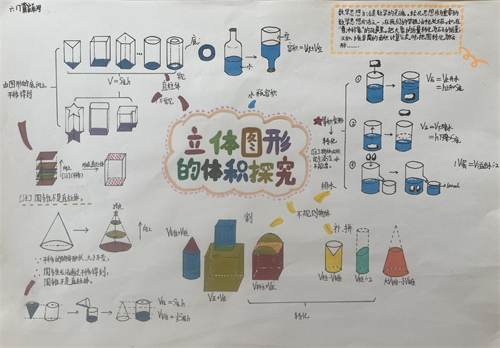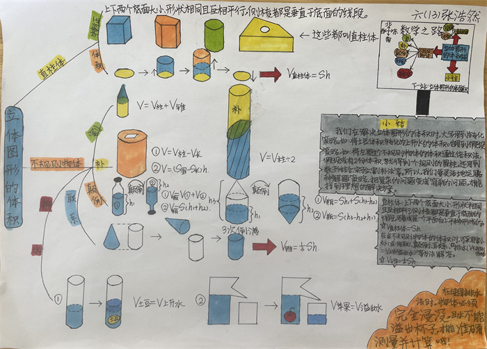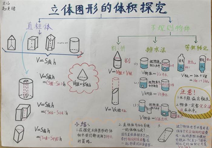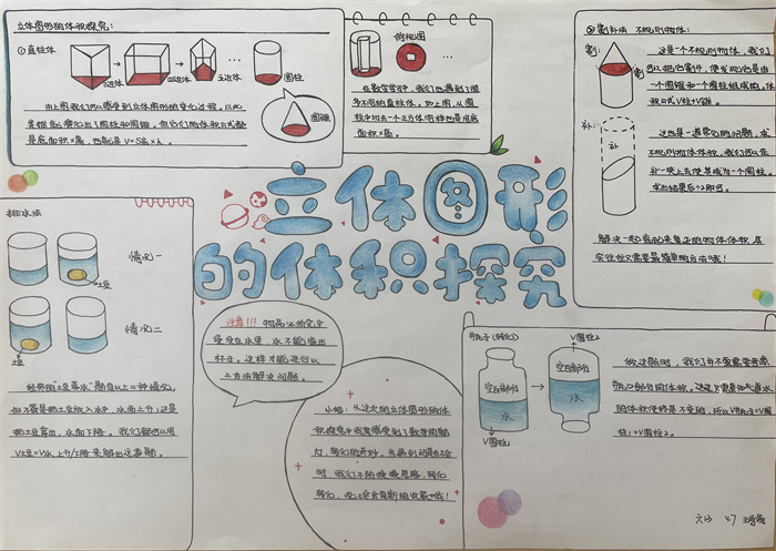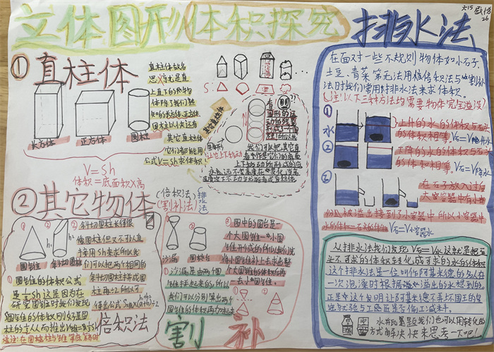 在此基础上,引导学生进一步探秘“立体图形体积”,学生进行了分类探究,对于三棱柱、长方体、圆柱等直柱体的体积,提炼了统一的体积公式,进而推广到一般的直柱体,使体积计算方法迁移到系统中所有对象,认知得到了一次飞跃;对于生活中的一些不规则物体,学生也开动脑筋,想到了排水法、割补法……学生图文结合,一幅幅生动、鲜活的作品跃然纸上。