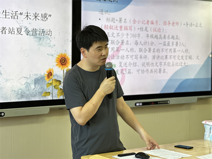 接着,郭老师从署名、人称等方面与小记者一起重温了《周报》投稿规则,又以《前行在“小萝卜头”向往的光明里》等优秀的稿件为范例,对小记者进行了写作方法的指导。他告诉小记者,只叙述不描写就是记流水账,叙述是骨架,而描写是血肉,也是最能让文章生动的写作手法。同时,郭老师也介绍了《周报》积分评优的标准,希望小记者们努力写出优秀稿件,争当优秀小记者、十佳小记者、标兵小记者。