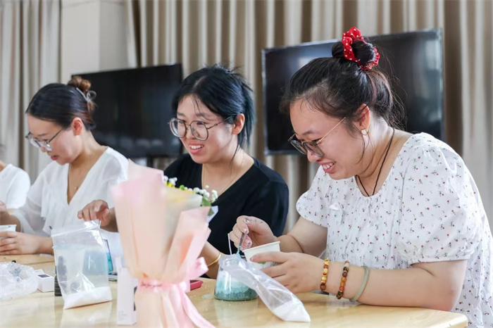 随后,大家将色彩、气味、创意等元素结合,制作出一杯杯色彩鲜明、样式各异、治愈又好闻的沙画香薰。不同色彩的沙子层次高低错落堆叠,每一层都凝聚着大家的巧思和创意。香氛与艺术在这一刻完美碰撞,散发出迷人的香气。