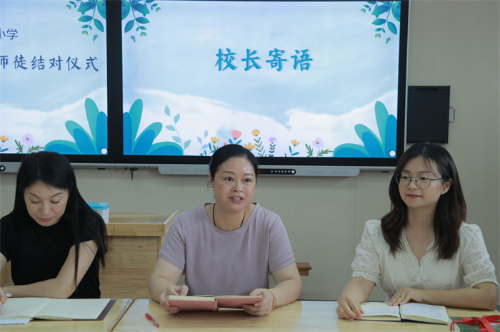教导主任孙洁宣读新结对师徒名单,希望新教师知晓并履行好师徒约定。孙主任勉励新教师和师傅一起智慧行走,碰撞出教学的火花,凝聚育人的智慧。