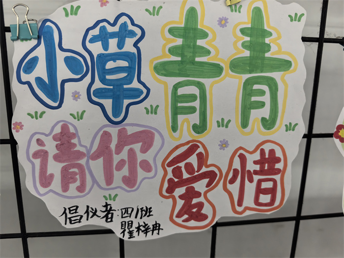 三四年级的同学们在班主任的带领下,开动脑筋,设计了积极向上、朗朗上口的校园环保标语。“小草青青,请你爱惜。”“保护花草,从我做起。”“烟头不落地,校园更美丽。”……这一条条环保标语,俨然成了校园的绿色名片。