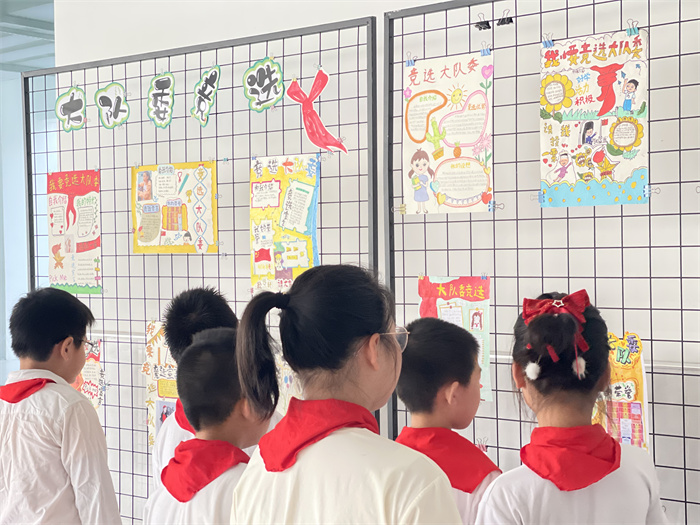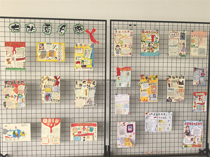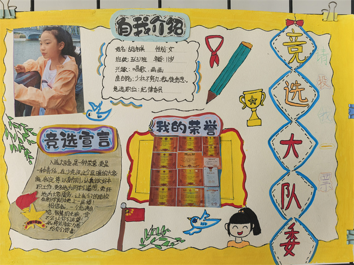 每位候选人都精心制作了竞选海报,通过图文并茂的自我介绍,信心满满的竞选宣言等,表达他们对少先队大队委工作的向往。