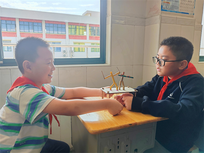 竹节人对战更是将活动推向了高潮。孩子们认真地操纵着自己的竹节人在课桌上展开激烈“战斗”,竹节人时而进攻,时而防守,精彩的对决引得围观的同学阵阵喝彩,教室里洋溢着欢声笑语,学习氛围空前热烈。