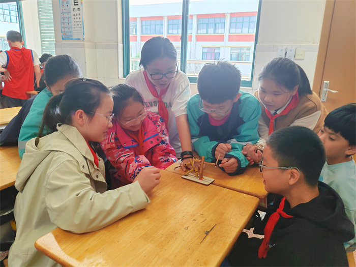 同学们亲手制作传统玩具竹节人,将课本知识与动手实践紧密结合,让学习变得生动有趣。他们将精心挑选的竹竿、吸管、卷成筒状的纸片等材料锯成不同长短,模拟竹节人的身体和四肢,认真地穿线、绑扎,并设计独特的造型、装饰和武器,将竹节人化身为一个个栩栩如生的小战士。