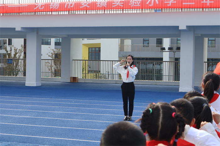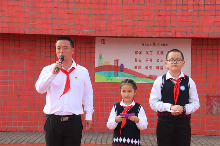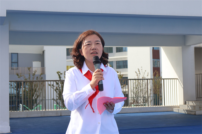 党组织代表徐艳艳、陆海江代表学校向新队员们送上了热情洋溢的入队寄语,勉励新队员们爱惜红领巾,学习革命先辈的精神,从小树立远大志向。她也对新队员们提出了殷切的希望,号召队员们发扬红领巾的优良传统,争当新时代的好队员。