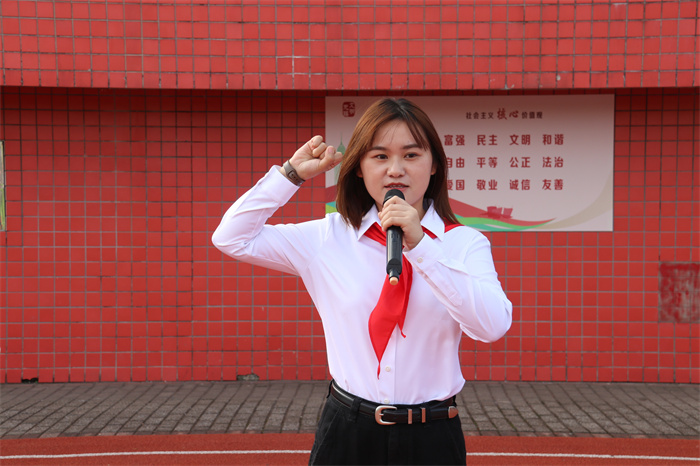 在大队长的带领下,所有队员面向大队旗庄严宣誓。他们紧握拳头,目光坚定,立志用自己的实际行动让胸前的红领巾更加鲜艳夺目。