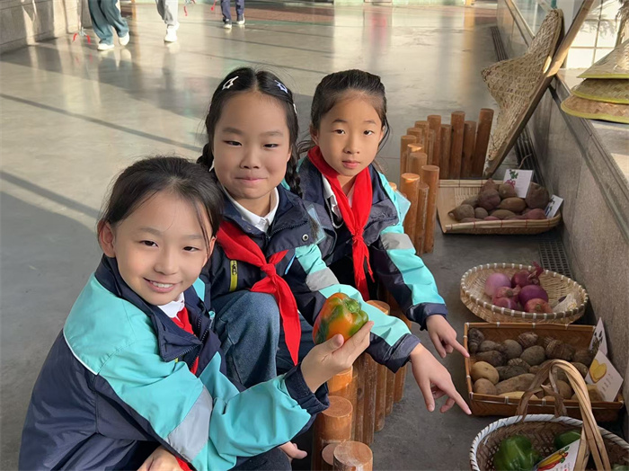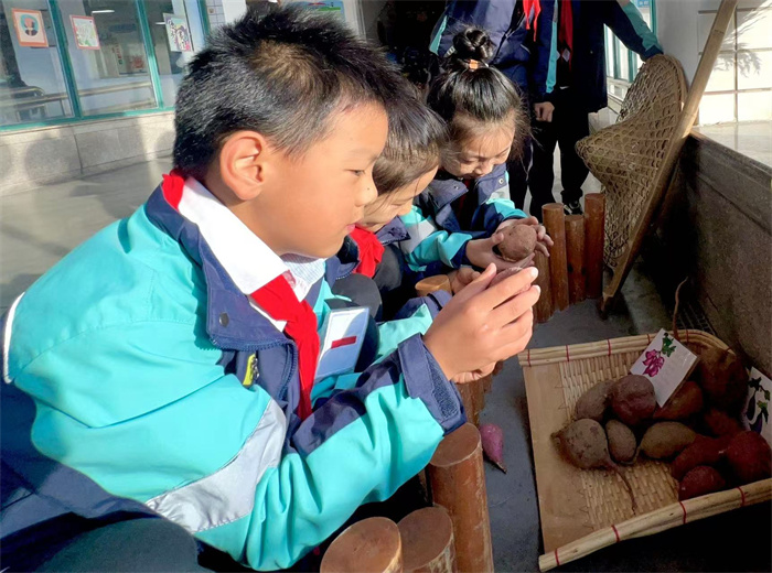 除了秋果,秋收的用具也引起了孩子们的关注。孩子们不仅观察了传统农具的特点,还体验了老物件的妙用。通过展示收集来的农耕用具,孩子们体悟到了农民伯伯劳作的辛苦和粮食的来之不易。
