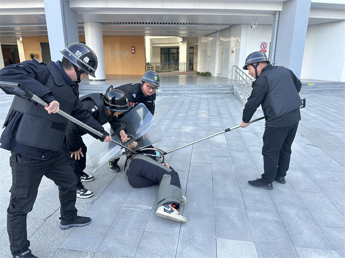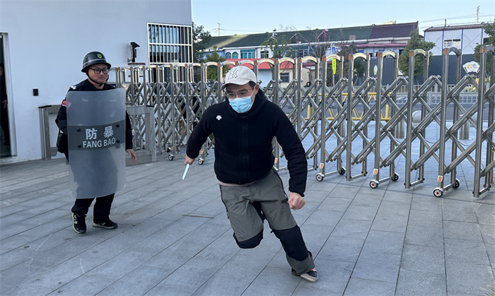 演练结束后,保安人员进行各种防暴器械的操练,如盾牌的防御技巧、警棍的击打动作,以及抓捕战术等,展现了良好的专业素养和应急能力。