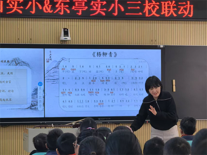 锡山实小樊殊老师执教的四年级《杨柳青》是一首江苏民歌,教学过程中,樊老师通过说、画等方式引导学生感受扬州方言的特点,领略江南丰富多彩的音乐文化。