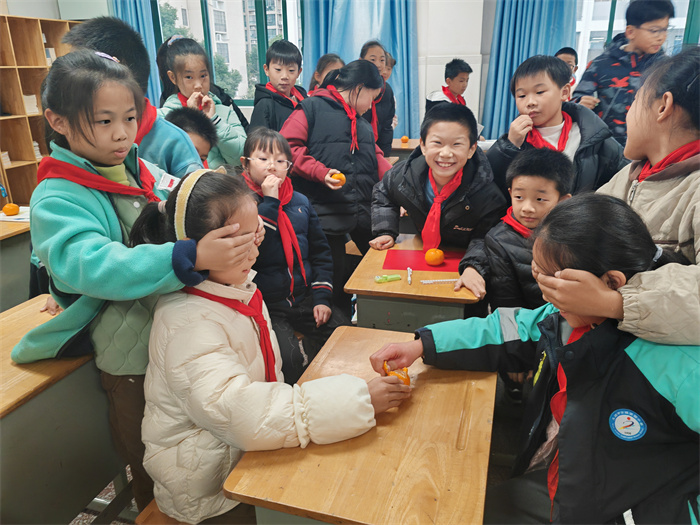丰收的果实进课堂,四年级“蒙眼剥桔子”比赛开始啦!老师们引导学生去观察,戴上眼罩去感受,在触摸活动中体会心灵的震颤。这次体验活动不仅让学生们感受到剥橘子的快乐,更让他们体会到了丰收的喜悦、团结的可贵、盲人的不易。最后,通过习作的形式把所见、所思、所想有序地写下来,学生创作出了一篇篇有思想力的、充满丰收和喜悦气息的习作。