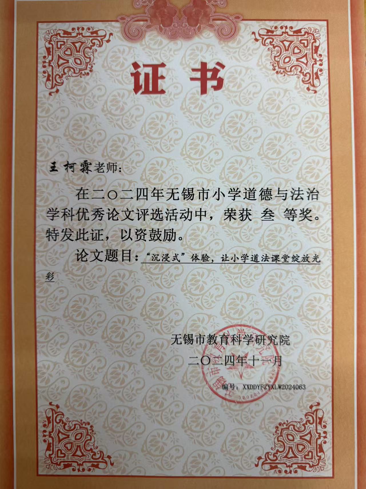 2024年无锡市小学道德与法治优秀论文评比活动中,