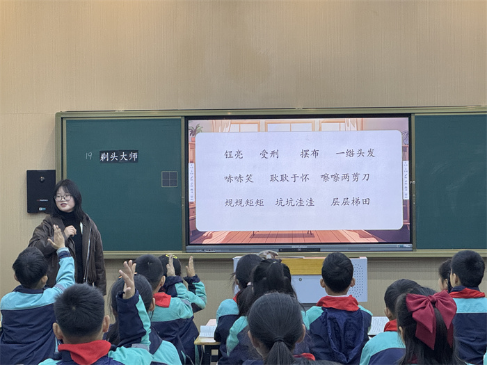 张珂老师执教一年级下册《动物儿歌》。她借助活泼有趣的图片、生动形象的视频,巧妙地带领学生闯关认识各种动物,并相机学习儿歌中的字词。吕赟老师执教三年级下册《剃头大师》,她引导学生抓住题眼“大师”,紧扣主角和事件,剖析老师傅和“我”剃头过程的不同,让学生身临其境地感受小沙的情绪变化,深刻理解人物特点。