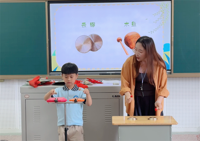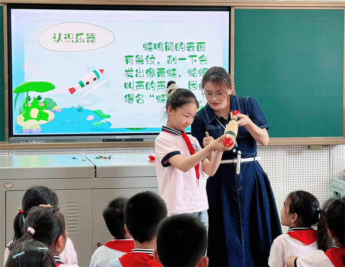 倪晓君老师执教《数蛤蟆》,沈梦婷老师执教《鸭子拌嘴》,两位老师根据学生发展特点,设计童趣有效的教学环节,挖掘民族音乐与生活的关联。教学中,两节课结合AI动画技术,让学生在直观的情境中,理解音乐结构;通过律动、打击乐、表演等形式表现音乐,感悟音乐魅力。