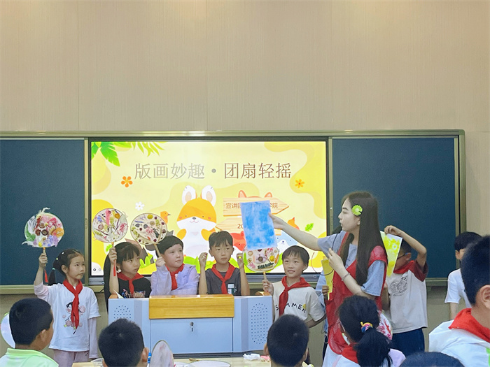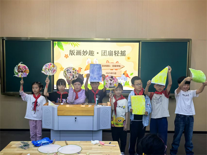 本次活动聚焦版画与团扇两项非物质文化遗产。无锡学院的青年志愿者们首先为队员们带来了生动有趣的非遗知识讲解,通过经典作品展示,深入浅出地阐释了版画的刀刻墨韵之美与团扇的东方雅致意境。随后,队员们兴致勃勃地投入到动手实践环节:在“创意DIY团扇”中,大家发挥奇思妙想,用干花在素面团扇上精心创作;在“版画制作体验”中,队员们认真学习用竹尖笔刻画、上墨、拓印的技巧,亲手印制出独特的版画作品。完成创作后,大家踊跃上台展示分享,并通过投票选出了优秀作品予以鼓励。