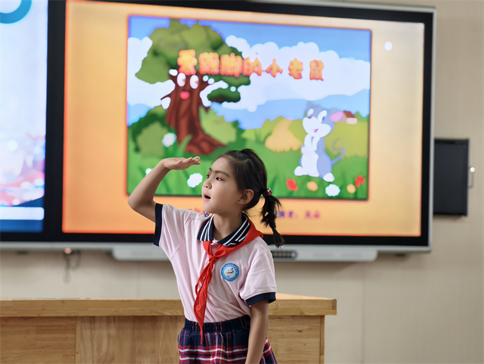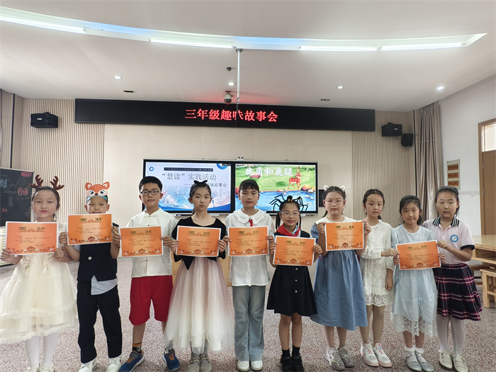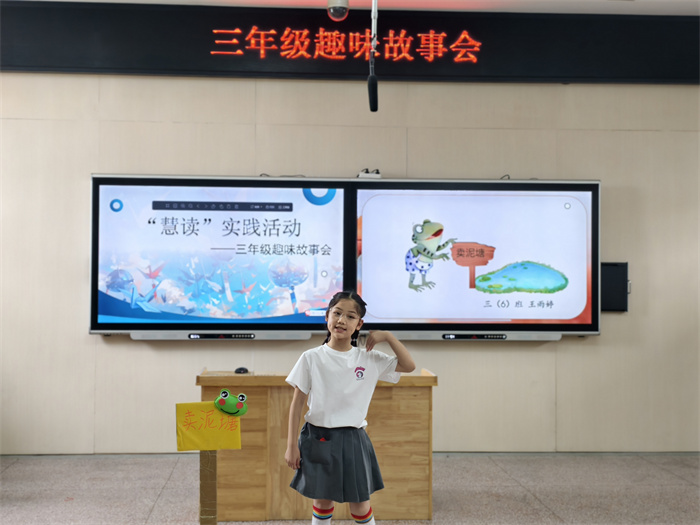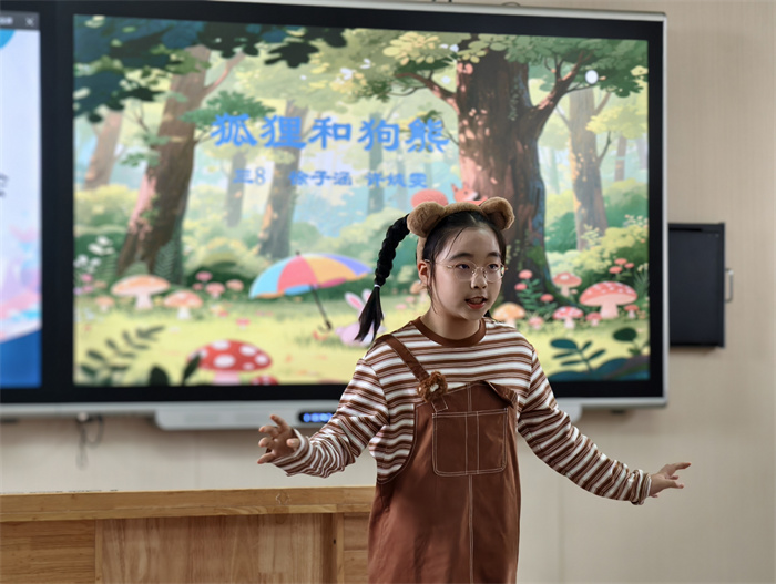 “童声传韵,笑漾故事。”三年级开展了别开生面的趣味故事会。《爱跺脚的小老鼠》以灵动的肢体与俏皮的台词,展现角色的可爱与执着;《狐狸和狗熊》用鲜活的语言交锋与夸张神态,演绎智慧与憨厚的碰撞;《青蛙卖泥塘》凭借精巧的场景布置和沉浸式表演,让观众身临其境感受改造的魅力……同学们以生动的讲述和惟妙惟肖的演绎将故事诠释得妙趣横生,掌声与喝彩声此起彼伏。