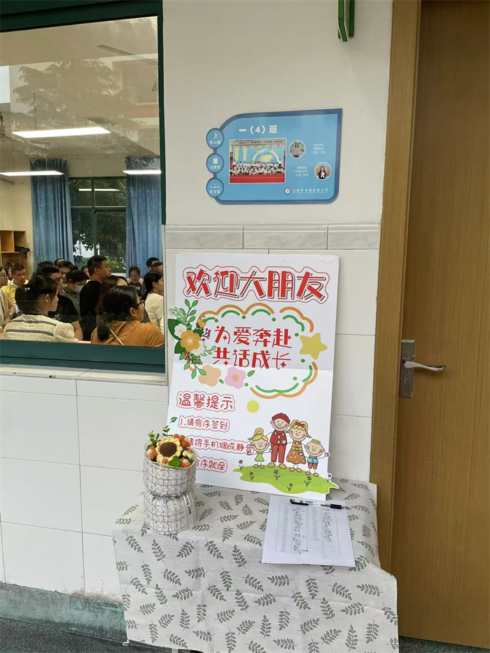 活动前夕,班主任便开始紧锣密鼓地筹备。在教室外,精心布置了充满温馨氛围的签到台:桌面上整齐摆放着彩色签到笔、制作精美的签到表,签到表旁还点缀着几盆绿意盎然的小盆栽,让家长们一踏入校园,便能感受到满满的仪式感。签到表不仅设计了家长姓名填写栏,还特别设置了“对本次活动的期待”留言区,方便班主任更好地了解家长诉求。此外,班主任提前将教室桌椅摆放成圆桌式,方便家长们分组交流;在教室后方的展示墙上,贴满了孩子们一学期以来的优秀作业、绘画作品和活动照片,每一处细节都彰显着用心。