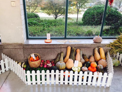 瞧!粒粒饱满的蒜头与火辣辣的红椒串出一首首丰收的乐曲;熟透的玉米在墙上舞蹈;形态各异的红薯、芋头在欢快地歌唱;南瓜围聚成堆,窃窃私语;稻子整齐地排列向大家展示着自己饱满的精神……路过的师生,都忍不住驻足欣赏这美好的丰收画卷。