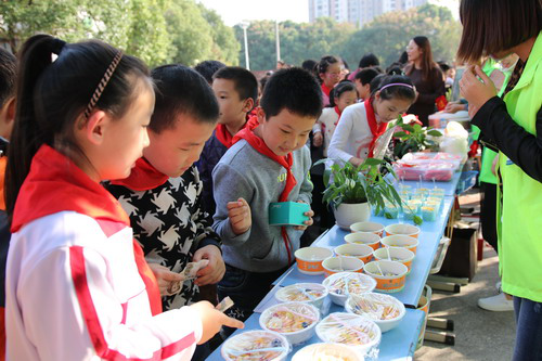 开幕仪式后,“美食乐翻天”活动拉开帷幕。在老师和家长志愿者的共同努力下,安小广场“变身”美食一条街,三年级10个班级“经营”起了一个个特色小铺。三(1)班的红薯银耳羹、黄金地瓜片、奶香地瓜丸子,各色红薯小吃让人眼花缭乱;三(3)班的红豆面包、红豆饼、红豆蛋挞、红豆春卷让人直流口水;三(8)班的“玉米之家”也是异彩纷呈:脆皮玉米棒、脆皮玉米香肠、玉米沙拉、玉米烙、玉米饼、玉米纸杯蛋糕,种类齐全、夺人眼球;三(9)班“舌尖上的芋头”最为畅销,桂花糖水芋艿、芋圆奶茶、白糖芋头、香酥脆芋头条大受欢迎……让人垂涎的各色美食,加上制作精美的宣传海报、放声吆喝的家长志愿者、同学们,安小的广场上沸腾起来了。