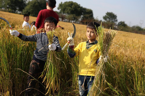 活动开始前,安小校长倪凯颜与志愿者家长、孩子们进行互动,“割稻时手握在哪里”“手里握多少稻就可以放在旁边”“怎么摆稻子”等问题,既是问答对话,也是割稻技巧的普及。一声令下,志愿者家长和孩子们手握稻束,挥舞镰刀,俯身弯腰,卯劲开割!在金色的稻田里,镰刀飞舞,笑脸飞扬,孩子们劳动着,更快乐着!