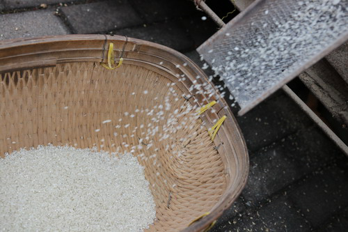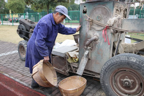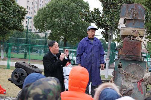 操场上,一台碾米机早已等候着大家,孩子们将它团团围住,打量着眼前这罕见的庞然大物。黄校长给大家介绍了碾米机的工作原理和碾米的相关知识。原来,碾米需要经过砻谷、谷糙分离,再到碾白、抛光等一系列工序。碾米师傅王爷爷用力摇响机器,“突突突,突突突……”伴随着机器声,雪白雪白的米粒从碾米机的“大嘴巴”里倾吐而出,装了一筐又一筐。孩子们排着队伍一个个近距离观看了新碾出来的大米,摸一摸,还是热乎乎的;闻一闻,空气中弥漫着阵阵清淡的米香味。