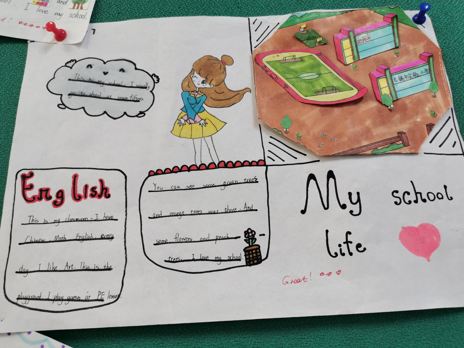 本次四年级英语融合课程基于教材《Project1 My school life 》的教学主题,融合了手工制作、美术创意和英语写作而开展。在“My school life”上,创设了“My dream school”、“Our playground”、“Our classroom”等场景,学生选择自己喜欢的场景,设计,描绘,剪贴制作自己的作品。然后用所学英语语言对作品进行描述,并展示交流。此次活动考验了学生的动手能力,锻炼了学生的英语表达能力。