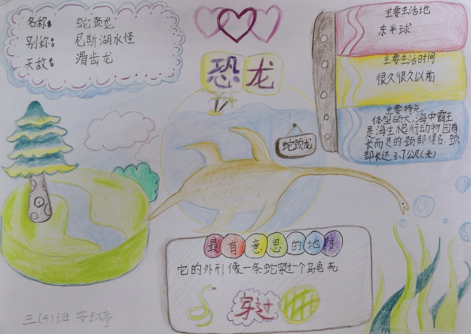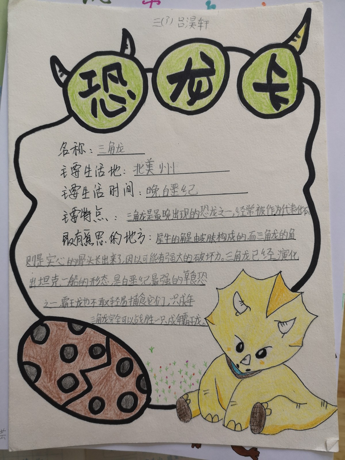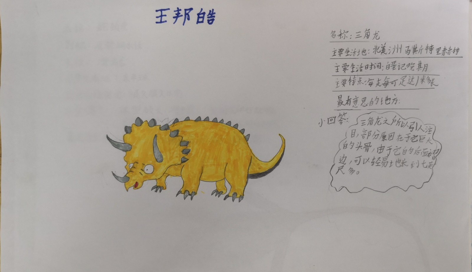 学生们通过查阅书籍、网络,了解了恐龙的种类,他们的名字命名的方式、恐龙的消失等知识。同时自己制作恐龙的卡片,小报等,通过多种形式把自己喜爱的恐龙知识和大家一起分享,在此过程中,锻炼了孩子搜集、整理并提取资料的能力,锻炼了学生的表达能力,更是全面地了解恐龙的相关知识,感受科普知识的丰富有趣。
