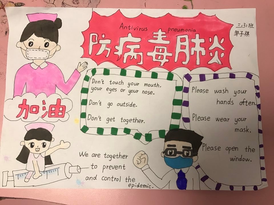 三年级的小朋友们待在家里,虽然没有上至“前线”,但他们结合这次线上教学内容Unit2 的句型Please…,Please(don’t)…,用自己的方式抗击疫情。